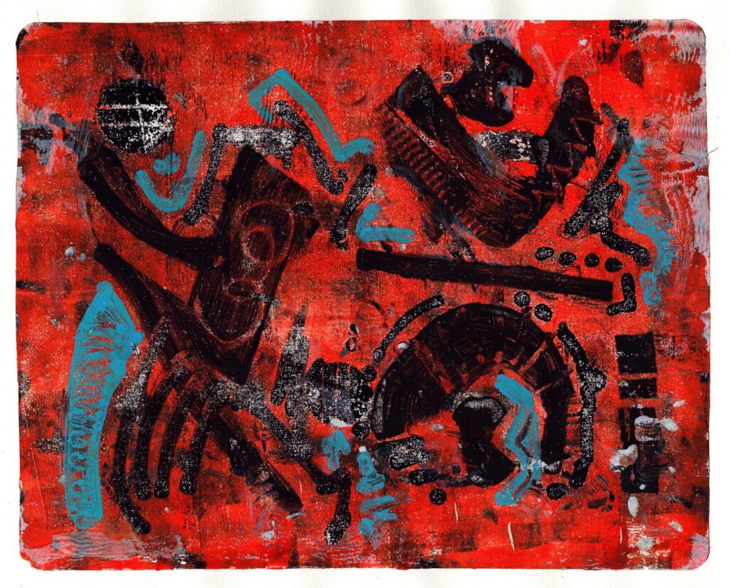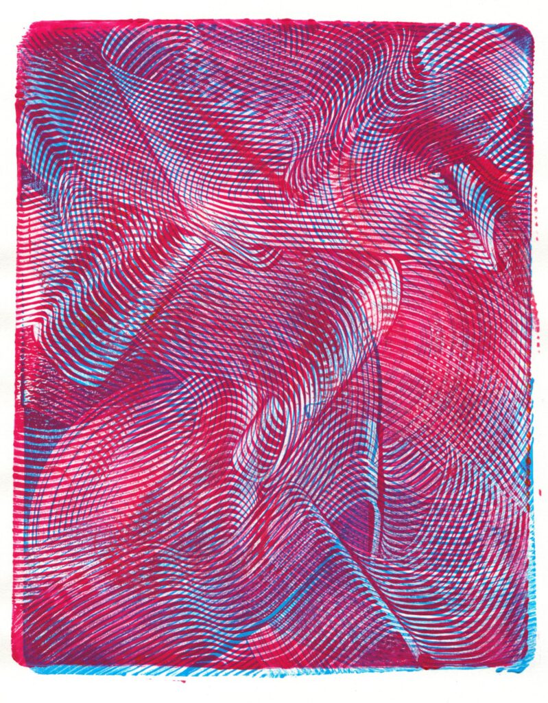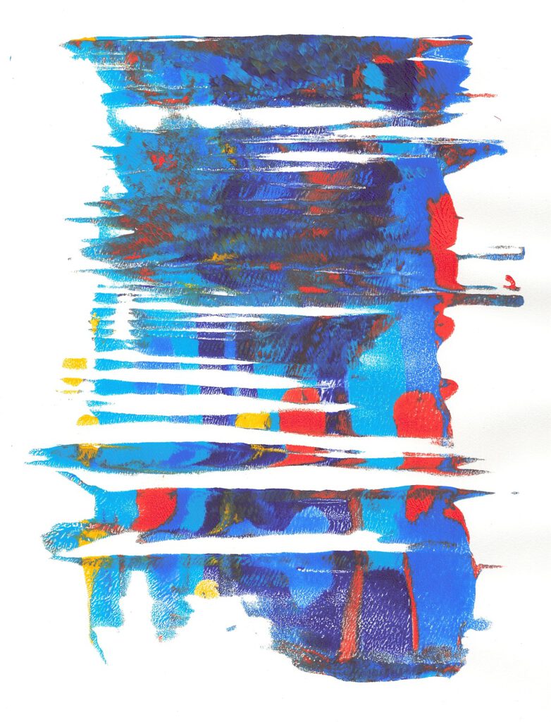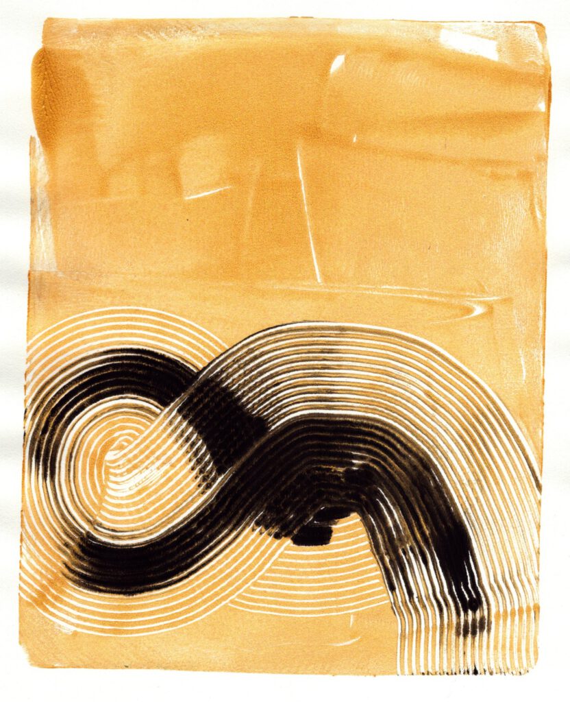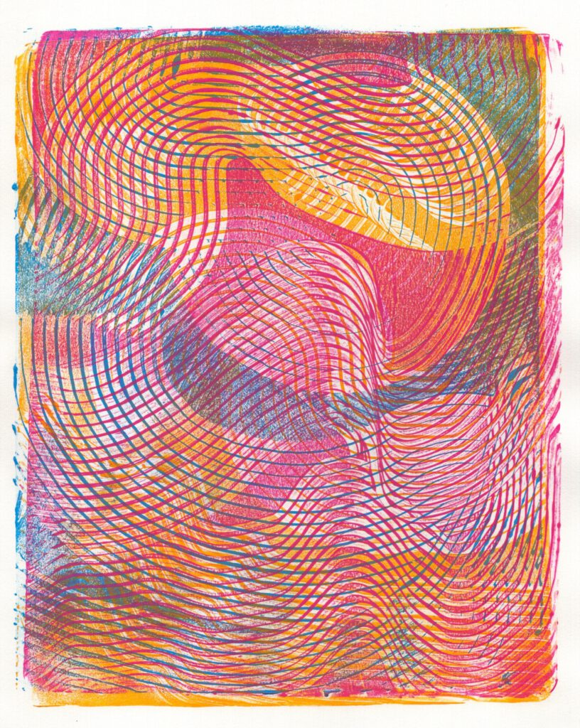 Die Arbeit mit Gelplatten macht jede Monotypie zu einem Abenteuer. Schicht um Schicht entstehen neue, oft unvorhersehbare Strukturen und Farbspiele. Der Prozess ist direkt, lebendig und voller Überraschungen.