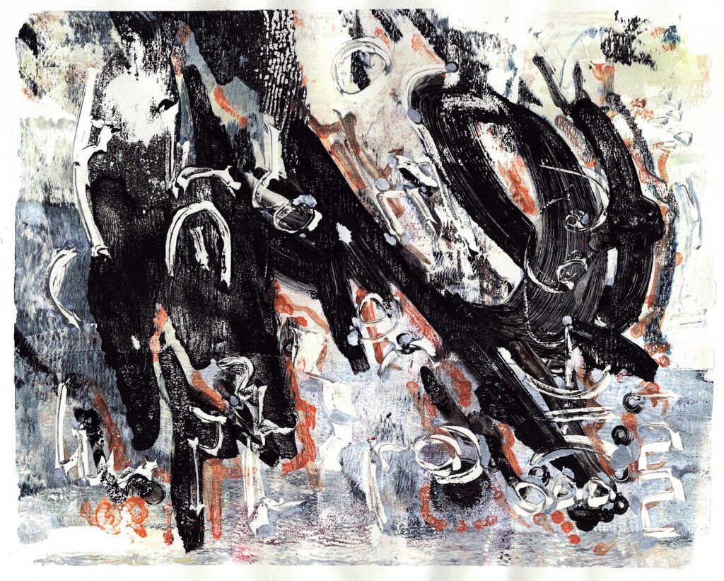 Was mich an Monotypien fasziniert, ist ihre Einmaligkeit: Es gibt nur einen einzigen Abzug, Wiederholungen sind unmöglich. Monotypien dulden keine Wiederholung. Sie fordern Geduld, Mut und die Bereitschaft, Scheitern als Teil des Weges zu akzeptieren – und belohnen mit Momenten reiner, unvorhersehbarer Schönheit.
